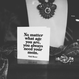 The photograph captures a heartfelt card featuring the quote, "No matter what age you are, you always need your mom," standing proudly on a wooden surface. Rich, muted tones and soft lighting provide a nostalgic mood, while accessories like a decorative necklace and bracelet add a touch of personal warmth. The composition draws the viewer's eye to the card, evoking feelings of love and sentimentality.