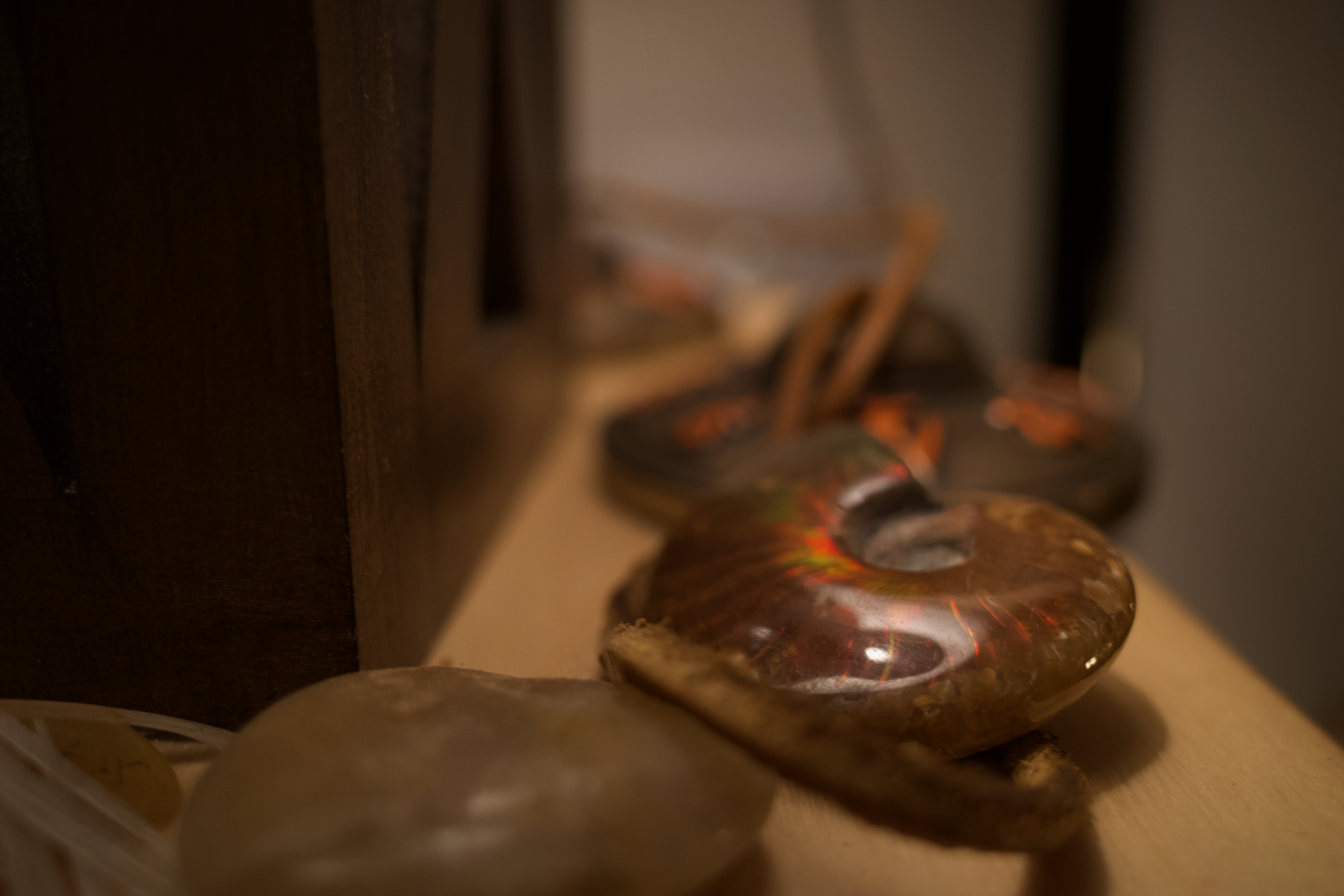 A serene collection of polished stones rests on a wooden surface, softly illuminated by ambient light. The gradual focus draws the eye from the foreground’s textured stones to the blurred, muted background. This intimate composition evokes a sense of tranquility and reflection, inviting contemplation of the beauty in simple objects.