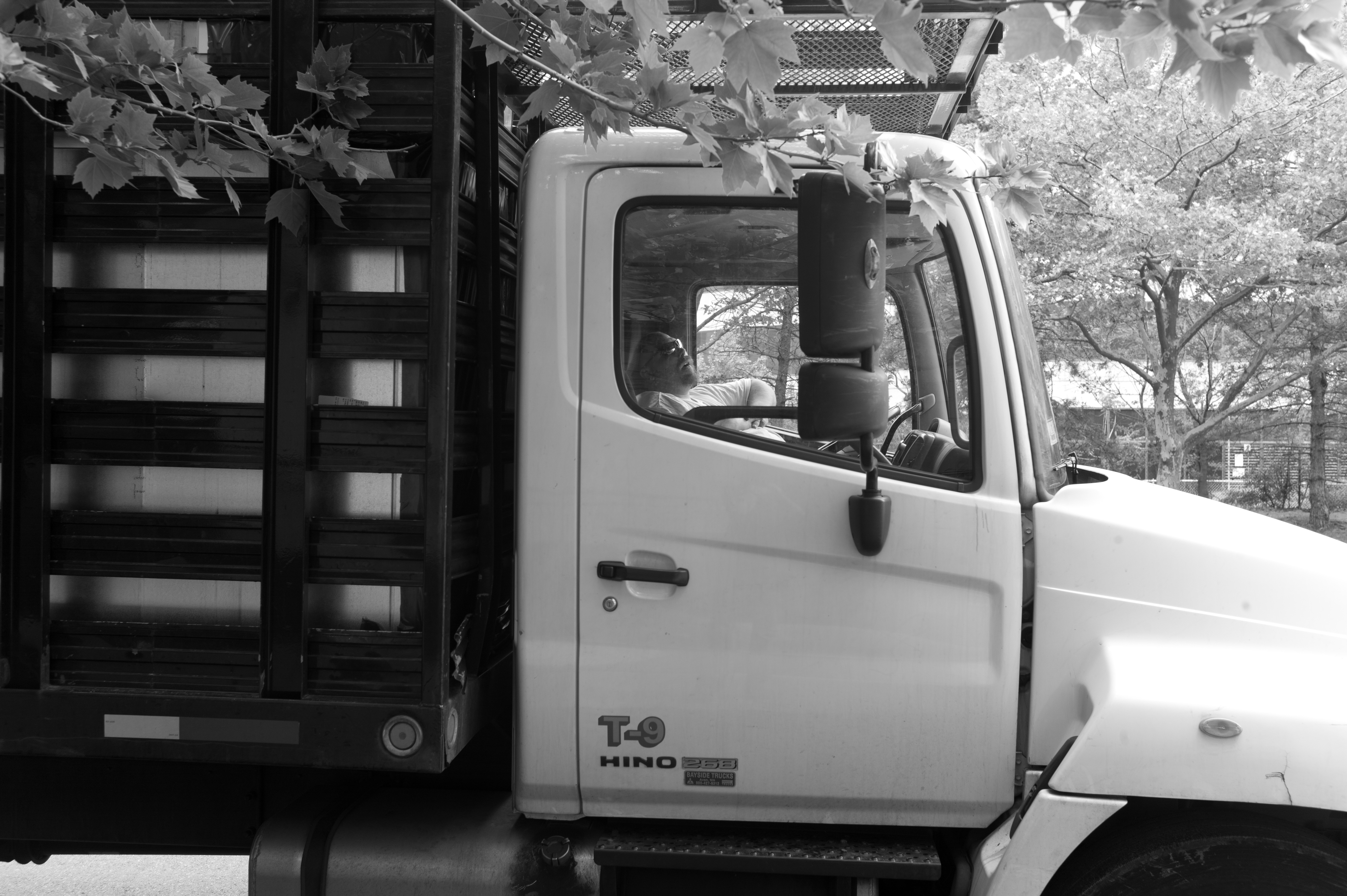 A large white truck sits quietly, half-obscured by overhanging branches, creating a sense of intimacy in the bustling environment. The driver, relaxed in his seat, embodies a moment of pause amidst the urban rhythm, captured in a striking black and white. Soft lighting filters through the foliage, enhancing the serene yet gritty tone of the scene.