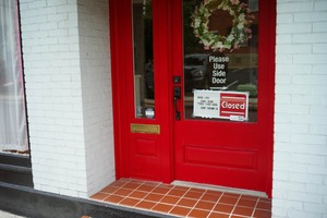 The photograph captures a bright red entrance to a shop, adorned with a floral wreath and a prominently displayed 'Closed' sign, creating a striking contrast against the white brick wall. The composition draws the eye towards the door, evoking a sense of anticipation mixed with disappointment, as the vibrant colors suggest warmth yet signify inaccessibility. The soft, natural light illuminates the space, enhancing the inviting yet unwelcoming mood of the scene.