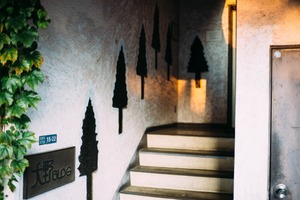 The photograph captures a serene staircase leading upward, adorned with silhouettes of trees on the textured wall. Warm sunlight softly illuminates the upper corner, enhancing the tranquil atmosphere, while creeping ivy adds a touch of nature. The composition invites a sense of curiosity and introspection, making the viewer ponder what lies at the top of the stairs.
