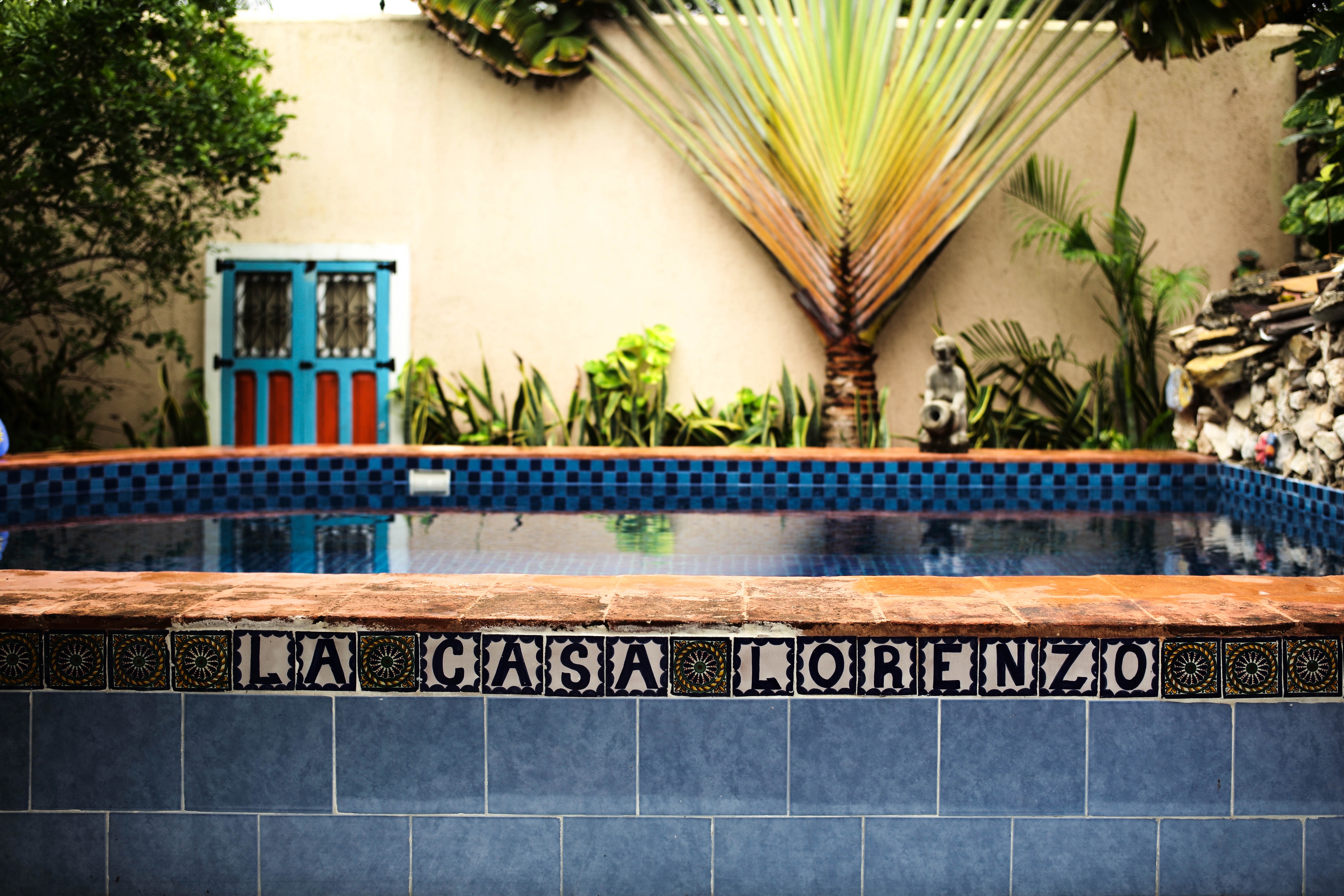 This photograph captures a tranquil swimming pool at La Casa Lorenzo, surrounded by lush greenery and a vibrant palm tree. The soft, natural light enhances the inviting blue hues of the water and tiles, creating a calm and welcoming atmosphere. The ornate tile work spelling 'La Casa Lorenzo' adds a charming, personal touch to the setting, making it feel like a hidden retreat.