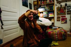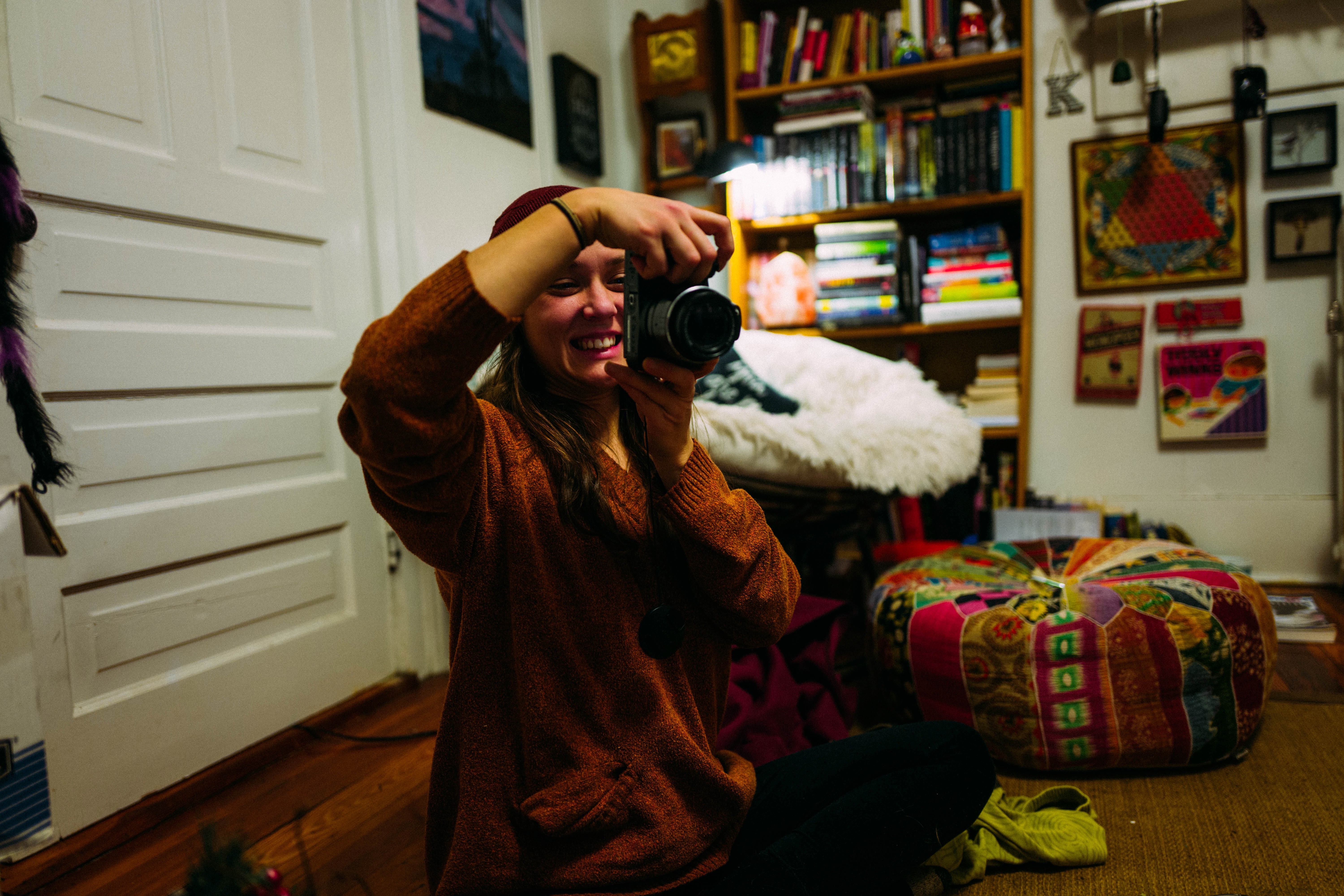 The photograph features a young woman sitting on the floor, holding a camera up to take a picture. Her bright smile and engaging posture create a lively, inviting mood, while the warm, cozy lighting enhances the intimate ambiance of her cluttered, artistic space filled with books and colorful cushions.
