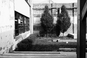 This photograph captures a serene courtyard scene framed by weathered brick walls and lush greenery. A pair of symmetrical trees stand prominently, creating a sense of balance against the textured backdrop, while soft light gently illuminates the tranquil space. The black-and-white composition evokes a timeless, contemplative mood, inviting the viewer to ponder the beauty in the ordinary.