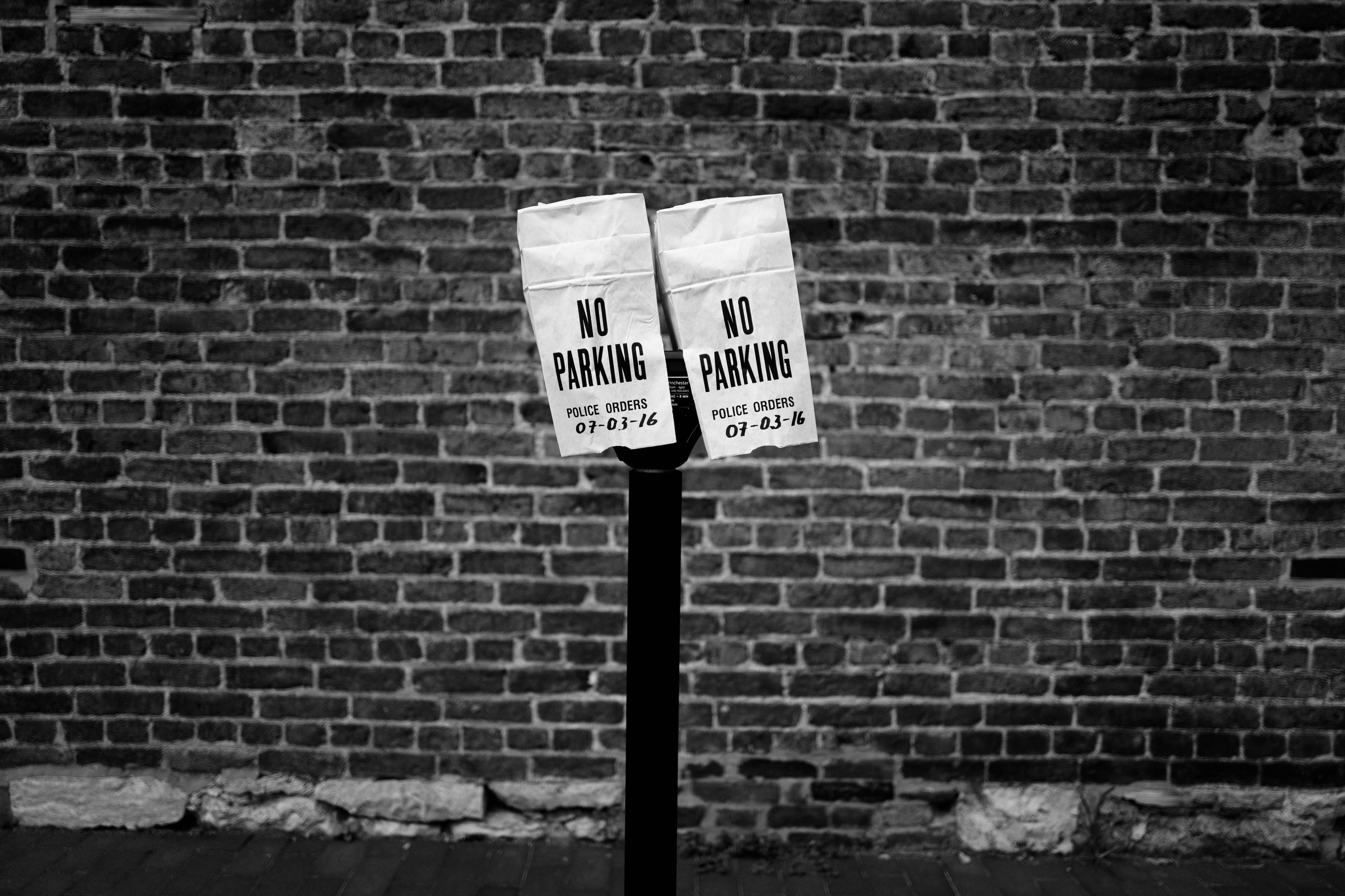 In stark black and white, two 'No Parking' signs rise from a simple pole against a textured brick wall, conveying a sense of urban desolation. The absence of color amplifies the mood of confinement and restriction, while the repetitive text highlights an authoritative presence. Shadows play softly on the brick, framing the signs and emphasizing their isolation in the cityscape.