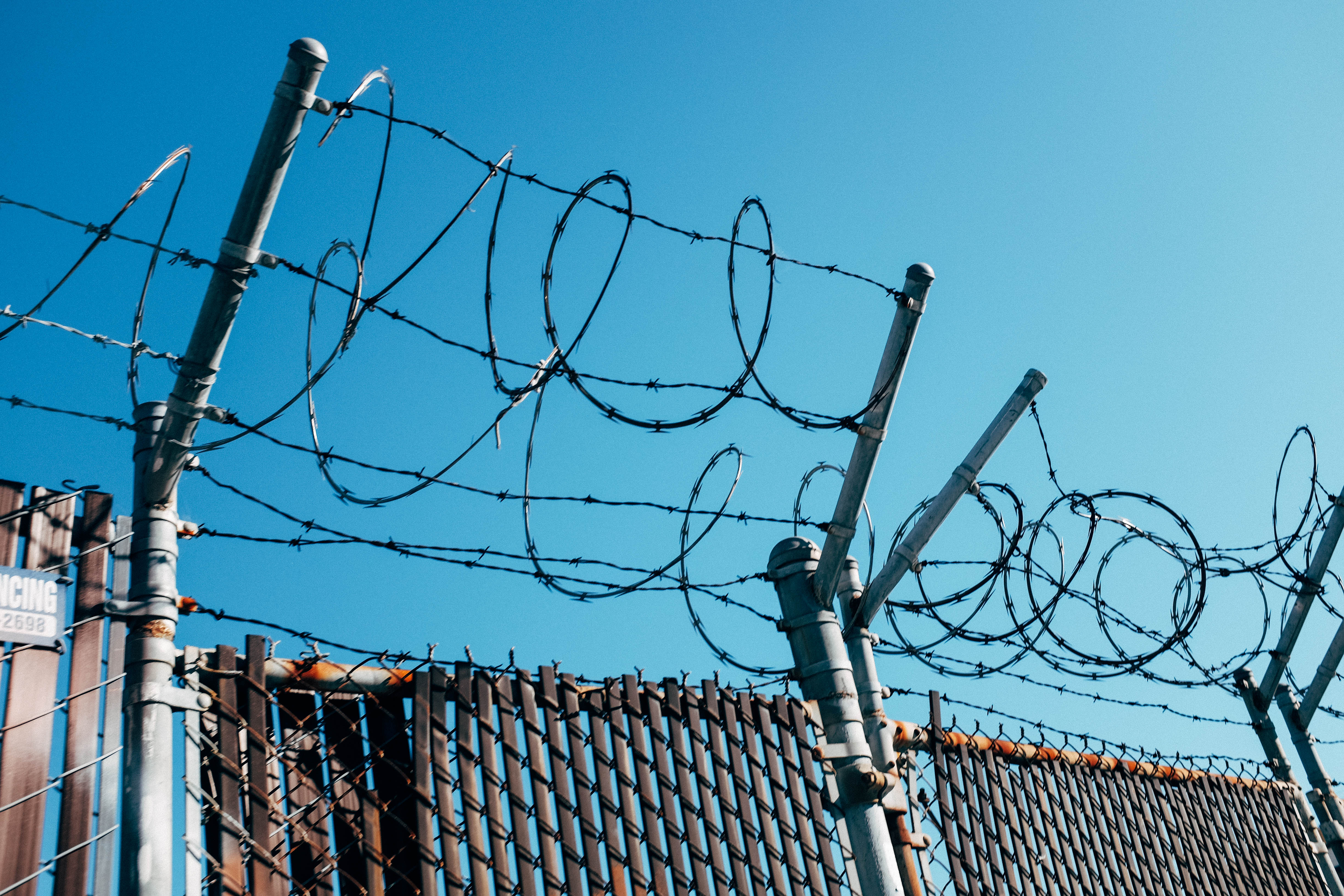 This photograph captures a close-up of barbed wire atop a chain-link fence under a clear blue sky. The stark lines of the fence and barbed wire contrast sharply with the vibrant sky, evoking a sense of confinement and separation. The composition emphasizes the oppressive nature of the barrier while simultaneously inviting a contemplative mood about freedom and restriction.