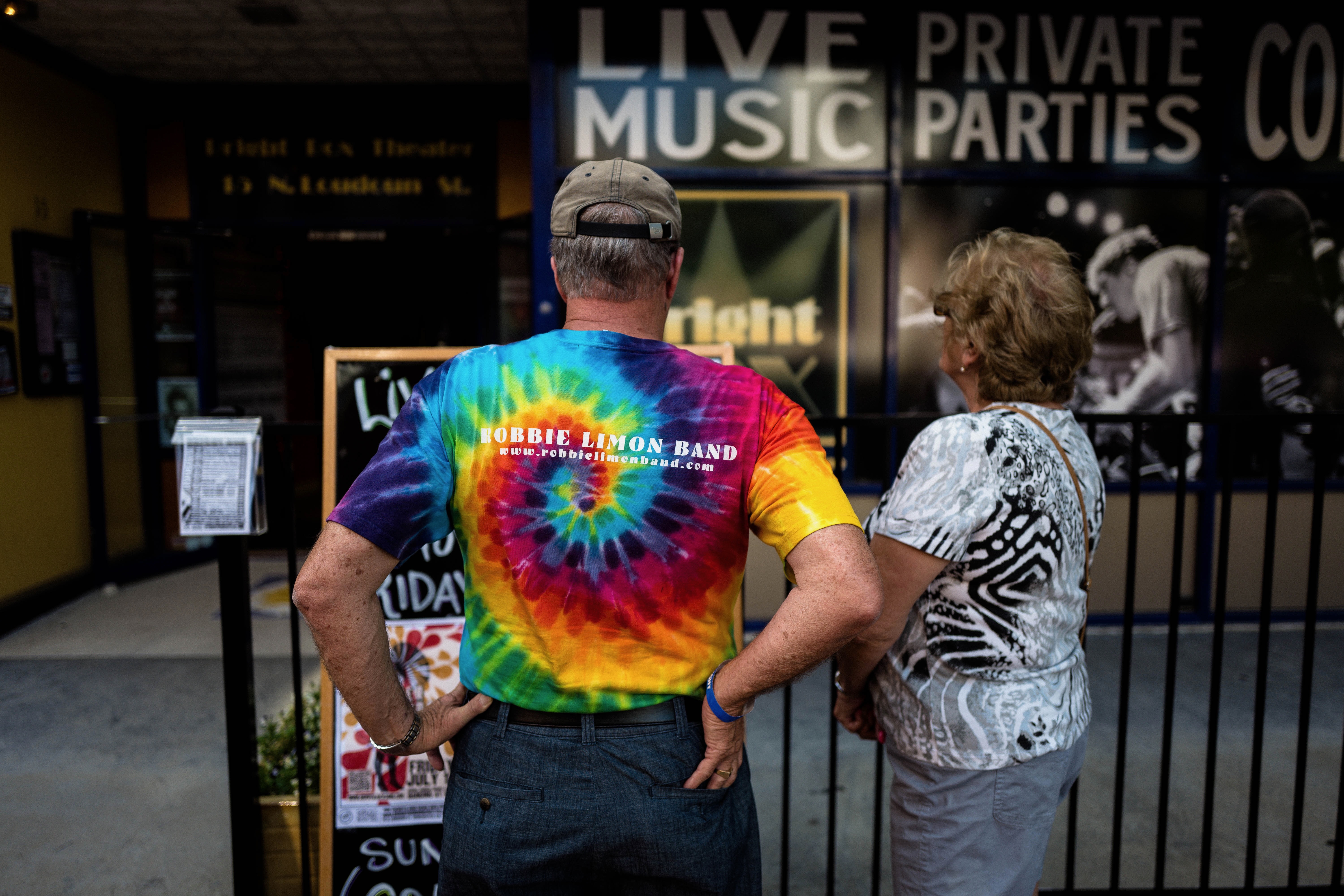 In this vibrant photograph, a man wearing a psychedelic tie-dye shirt stands with a woman outside a lively music venue, their backs to the camera. The glow of the lights and the bold signage proclaiming 'LIVE MUSIC' sets an inviting, energetic mood, hinting at the excitement of the upcoming event. The composition captures a moment of anticipation, as the couple prepares to immerse themselves in the performance ahead.