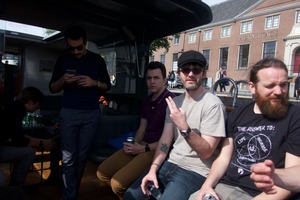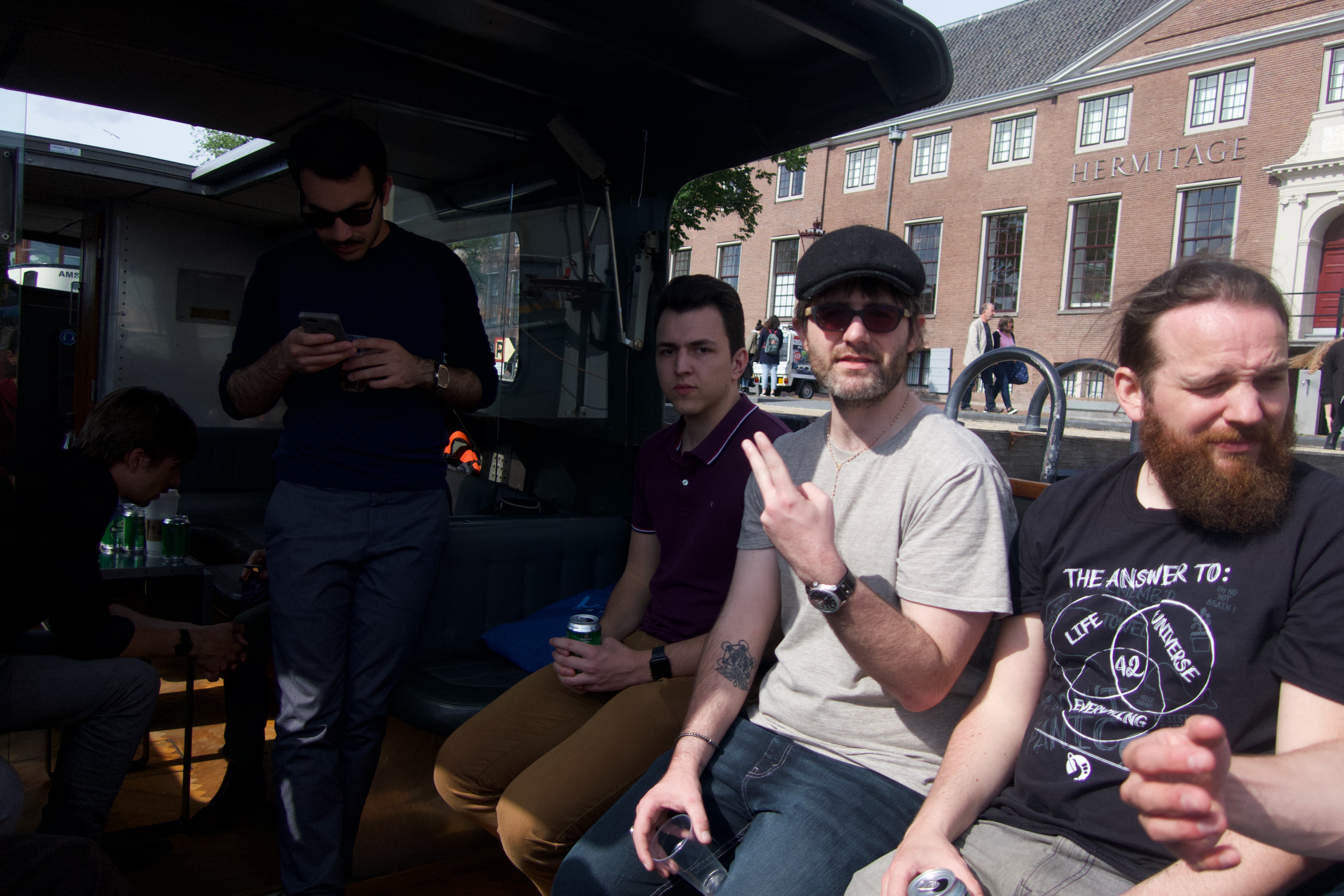 In a relaxed setting on a boat, a group of men captures a moment of camaraderie. The warm sunlight casts a joyful glow, highlighting their varied expressions and distinct styles, from casual tees to fashionable hats. The background hints at an urban landscape, adding to the laid-back yet vibrant atmosphere of the scene.