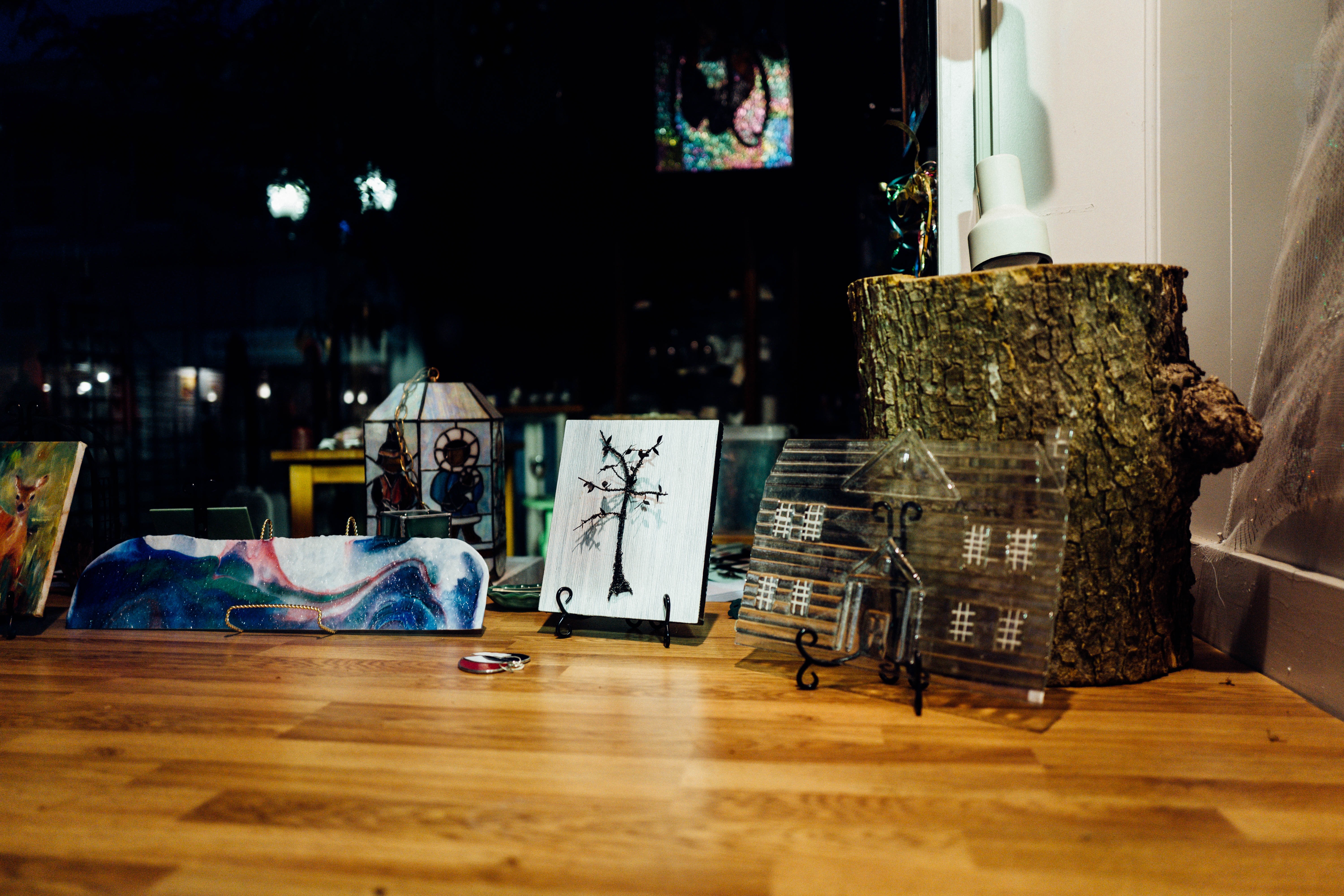 A cozy assortment of small artworks is arranged on a wooden surface, illuminated by soft, ambient lighting. The pieces feature vibrant colors and intricate designs, evoking a sense of creativity and warmth in a relaxed atmosphere. The background hints at a deeper space, with blurred shapes and colors, creating an inviting mood for artistic expression.