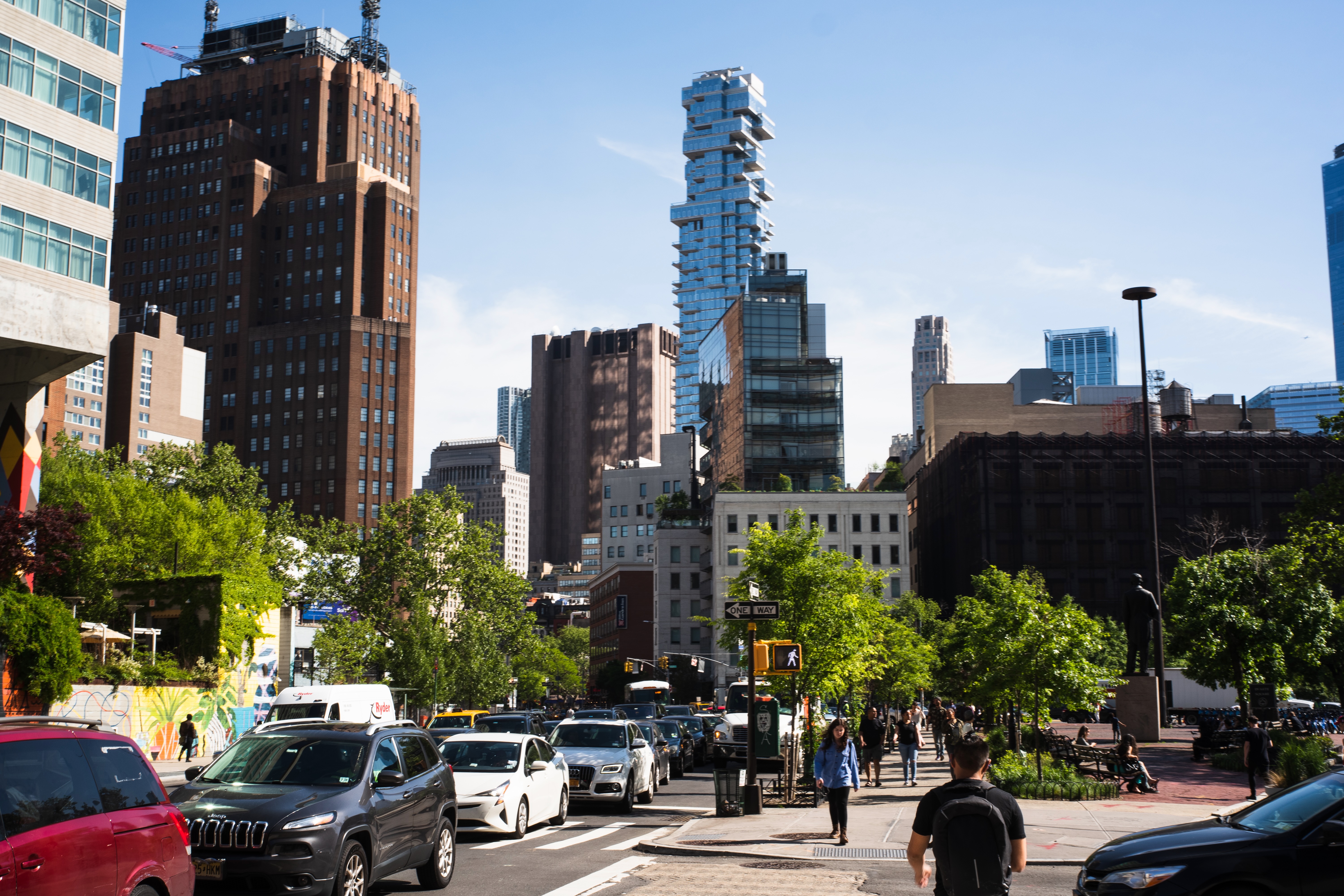 A vibrant city scene captures the juxtaposition of modern skyscrapers against classic architecture, framed by lush greenery. The bright blue sky brings a sense of openness and warmth, while the bustling street suggests a dynamic and lively urban atmosphere. Cars and pedestrians move through the scene, creating a rhythm of city life that feels both energetic and inviting.
