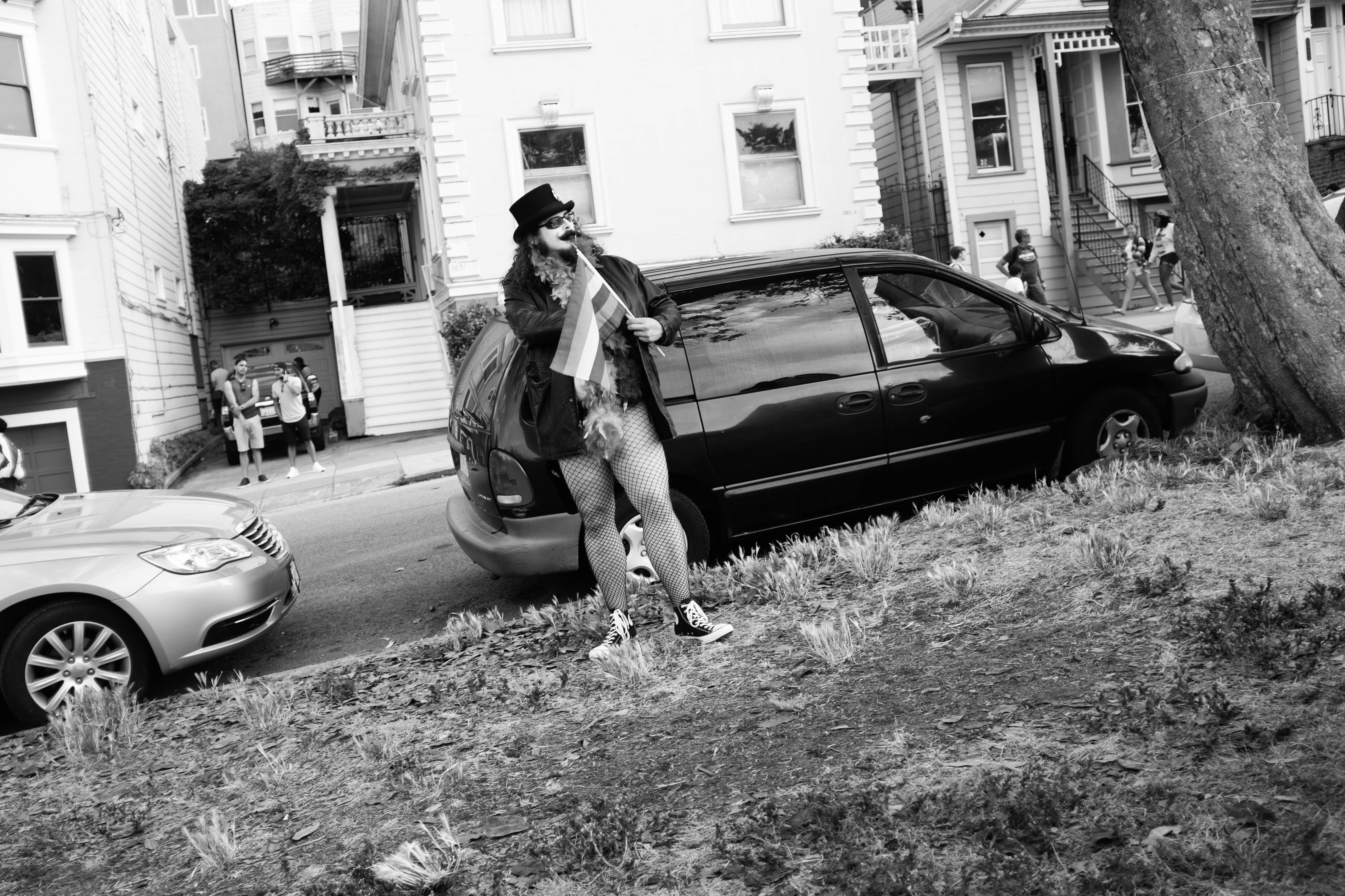 In a striking black and white photograph, a flamboyant figure clad in fishnet tights and a feather boa stands confidently beside a parked car, holding a pride flag aloft. The contrasting shadows and highlights create a vibrant yet moody atmosphere, emphasizing the subject's bold expression against the backdrop of a lively urban scene. Surrounding onlookers hint at a festive environment, adding to the sense of celebration and individuality.