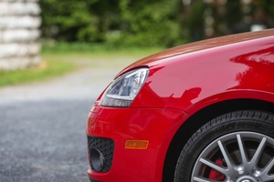 The photograph captures a striking close-up of a red car, emphasizing its sleek curves and glossy finish against a softly blurred natural backdrop. The balanced composition highlights the details of the headlight and tire, while the warm lighting brings a sense of vibrancy and energy, suggesting the thrill of the open road.