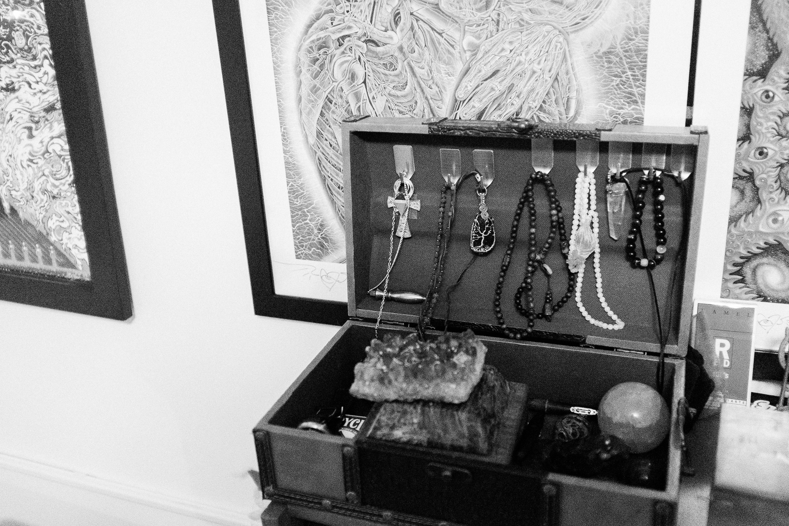 This monochromatic photograph captures a vintage wooden box filled with an assortment of necklaces and crystals, exuding a sense of intrigue and nostalgia. The intricate designs on the surrounding artwork enhance the mystical vibe, while soft lighting casts gentle shadows, adding depth to the scene. The composition highlights both the treasured artifacts within the box and the captivating textures of the wall art behind it, creating a harmonious blend of the tangible and the ethereal.