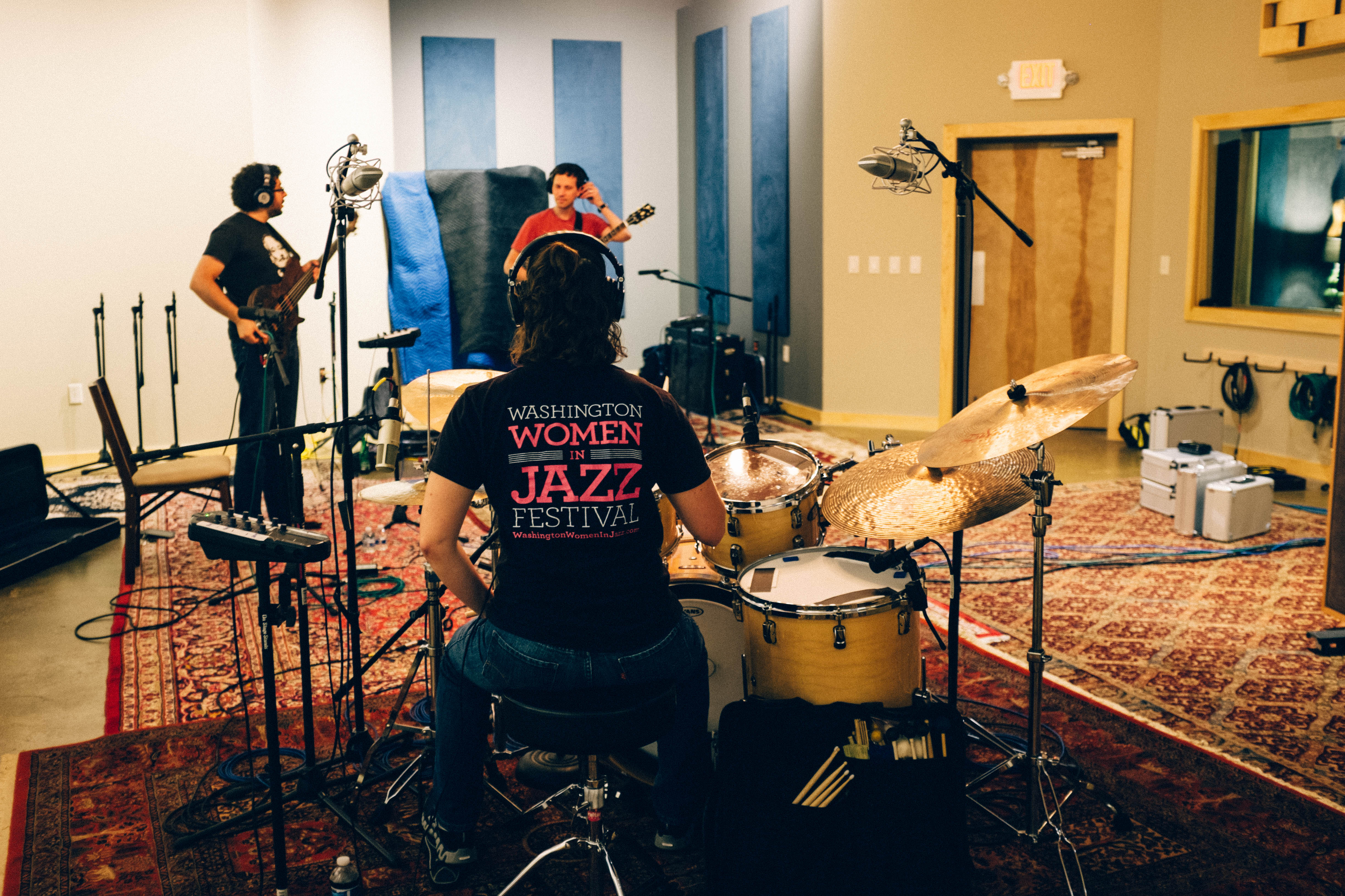 The photograph captures an intimate moment in a recording studio, showcasing a female drummer in focus as she plays with concentrated passion, her back to the viewer. Surrounding her, fellow musicians resonate with the rhythm, creating a collaborative energy under soft, warm lighting that reflects the spirit of creativity and camaraderie. The rich textures of the instruments and the vibrant yet subdued decor enhance the atmosphere, inviting the viewer into this artistic enclave.