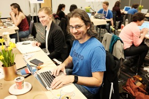 In an energetic workspace filled with engaged individuals, a man in a blue shirt smiles brightly as he works on his laptop, radiating enthusiasm. The bright lighting accentuates the fresh yellow flowers on the tables, creating a lively atmosphere of creativity and collaboration. Participants are focused, with a mix of professional and casual elements emphasizing a relaxed yet productive environment.