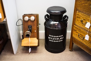 This photograph captures a charming juxtaposition of vintage items—a classic wooden telephone and an old-fashioned milk canister marked with 'WELCOME.' The soft, natural lighting highlights the warm tones of the wood and the glossy black of the canister, evoking a nostalgic mood. The careful composition draws the viewer's eye across the two objects, celebrating a bygone era of simple communication and hospitality.