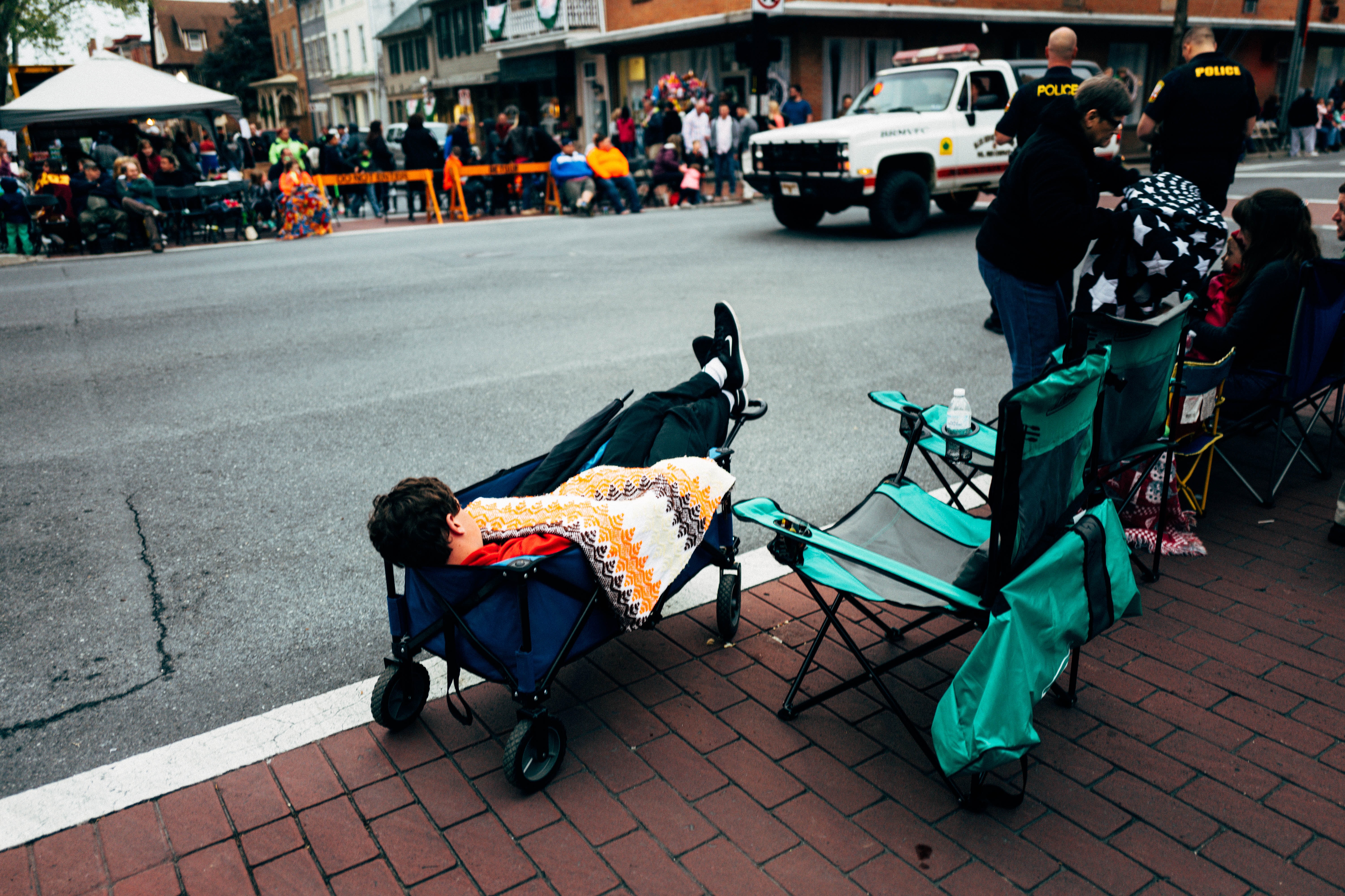 In this candid street photograph, a young boy lounges casually in a folding chair, draped with a colorful blanket, while vibrant festivities unfold in the background. The mood is relaxed and informal, contrasting the busyness of the parade as people gather to enjoy the spectacle. Soft, diffused lighting enhances the colors of the scene, providing a warm yet subdued ambiance amidst the excitement.