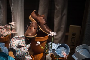 A warm and inviting display features a pair of polished brown shoes elegantly perched on a terracotta pot, surrounded by colorful hats and delicate flowers. The soft lighting casts gentle shadows, enhancing the textures and colors, creating a cozy, fashionable atmosphere. The composition draws the eye upward, inviting a sense of discovery within this charming arrangement.
