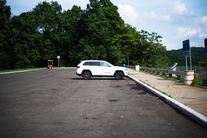 A lone white SUV stands parked on a deserted lot, surrounded by lush greenery under a bright sky. The stark contrast between the vehicle and its expansive, empty surroundings creates a sense of isolation and contemplation. Soft, natural lighting accentuates the scene, evoking a tranquil yet melancholic mood.