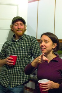 In a cozy kitchen setting, two friends stand close together, sharing in warm laughter and conversation. The soft, warm lighting enhances the casual, inviting atmosphere, while their expressions reveal a moment of connection and enjoyment. The vibrant red cups they hold add a playful touch to the scene, capturing the essence of a relaxed evening gathering.