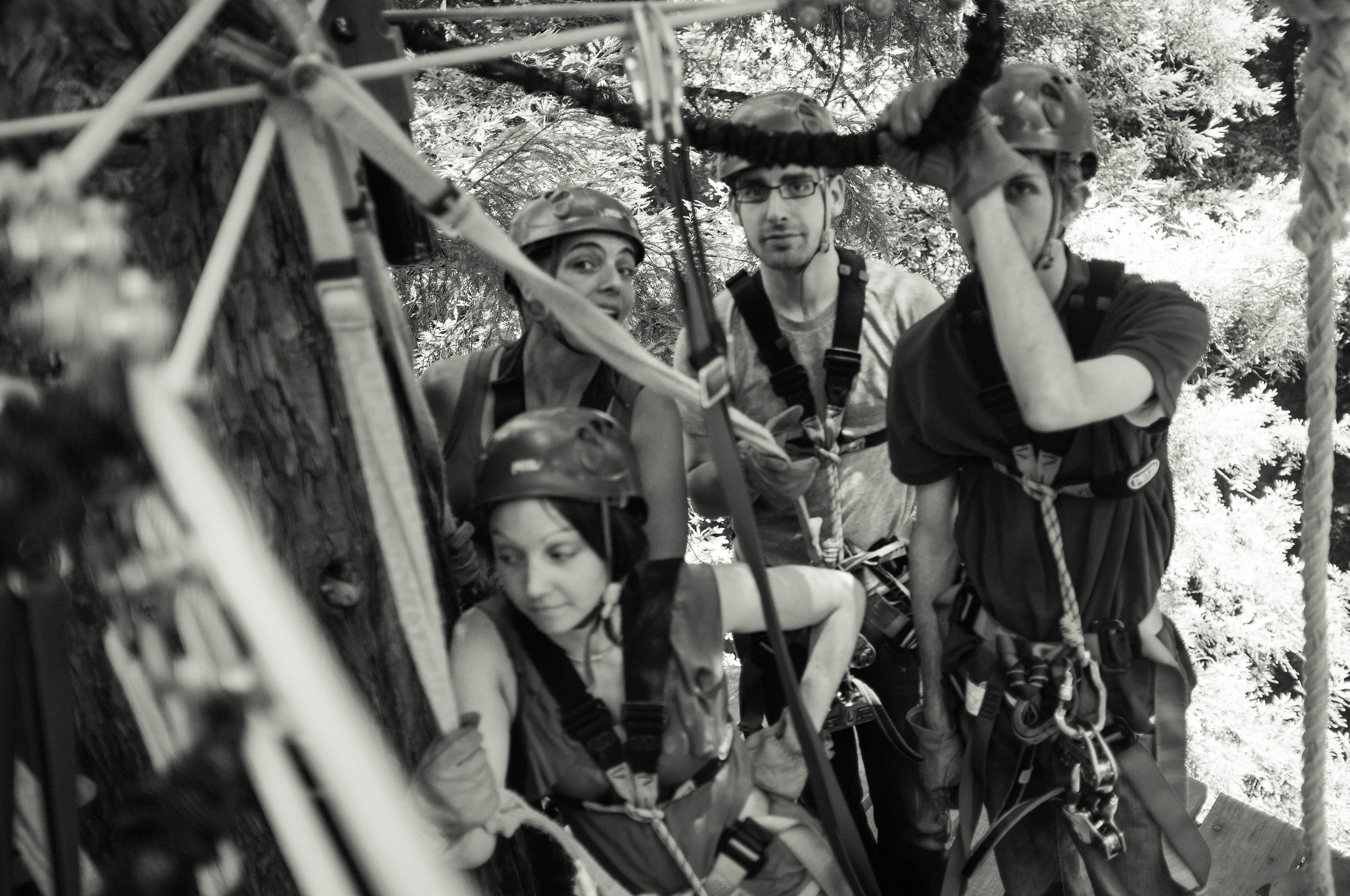 In this black and white photograph, four individuals dressed in climbing gear gather in a lush forest setting, their expressions revealing a mix of anticipation and camaraderie. The composition is infused with dynamic lines from the surrounding climbing equipment, while soft, dappled light filters through the treetops, enhancing the adventurous mood. Each figure is immersed in the moment, embodying the thrill of exploration and teamwork against the backdrop of nature.