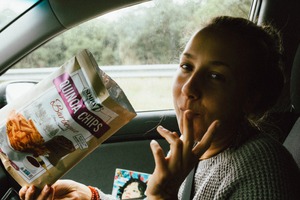 In a cozy car interior, a young woman playfully poses with a bag of barbecue quinoa chips, her fingers teasingly touching her lips. The soft, diffused lighting enhances her cheerful expression, while the blurred green background hints at a scenic journey. The composition captures a moment of simple joy and spontaneity during an adventure.
