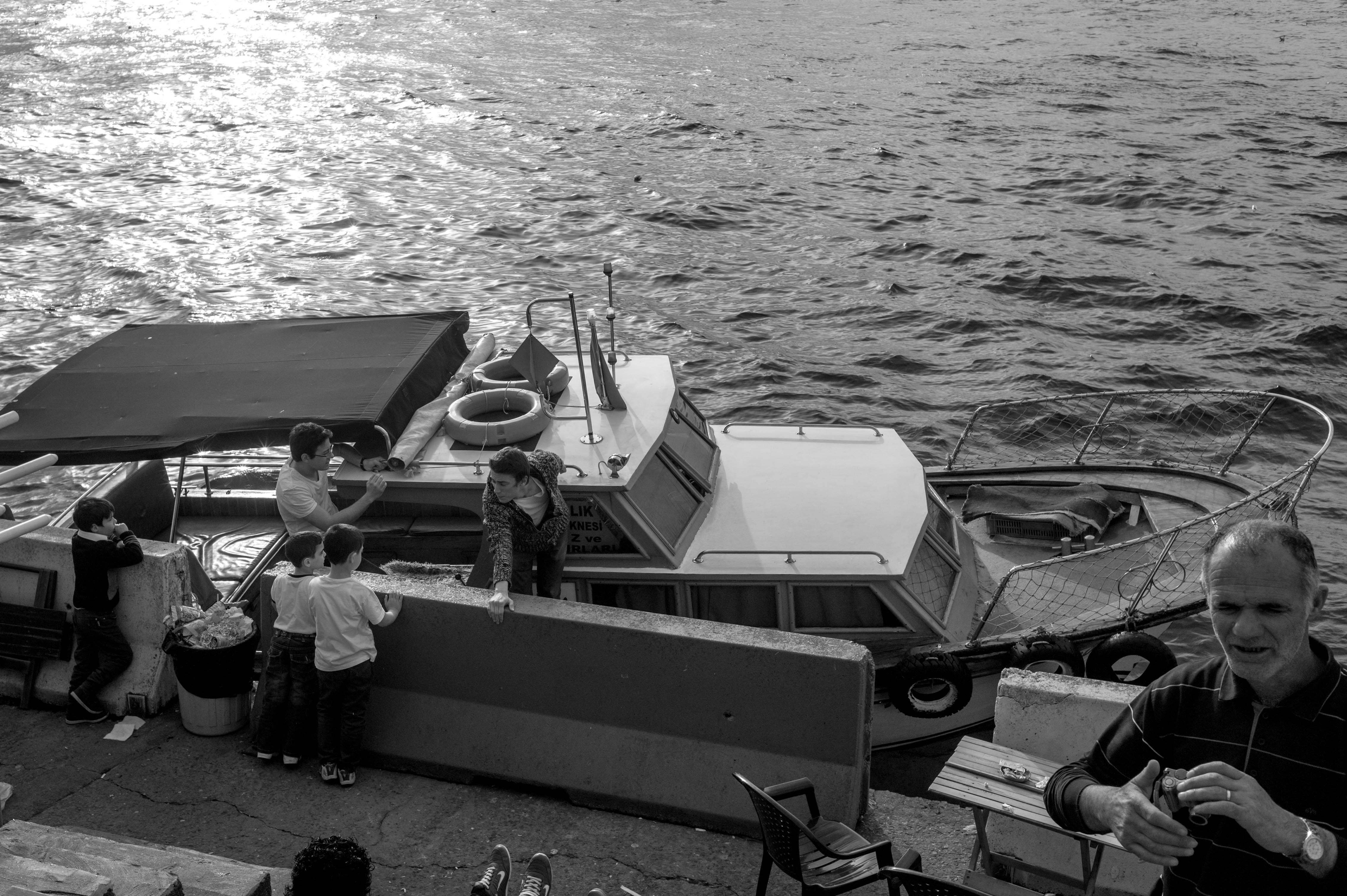 In this serene monochrome scene, a group of children play near a modest boat docked at the water’s edge, while an adult engages in conversation with a woman. The shimmering surface of the water reflects soft light, enhancing the tranquil yet lively mood of the moment. The composition draws the eye from the figures on the steps to the peaceful waters beyond, embodying a moment of community and leisure.