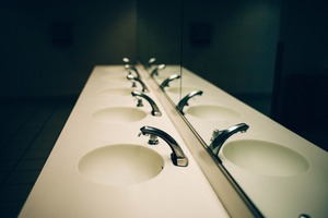 A stark, minimalist bathroom scene features a line of gleaming metallic faucets against a smooth white countertop. The muted lighting casts a calm ambiance, enhanced by the reflective surface of the long mirror, creating a sense of quiet solitude. This composition invites contemplation, merging functionality with an understated aesthetic of simplicity.