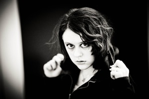 The photograph captures a young woman with striking features, her intense gaze piercing through the lens. Her disheveled hair and dark hoodie contribute to an atmosphere of quiet defiance and introspection, while the stark black and white composition enhances the emotional weight. Shadow and light play across her face, evoking a sense of mystery and raw vulnerability.