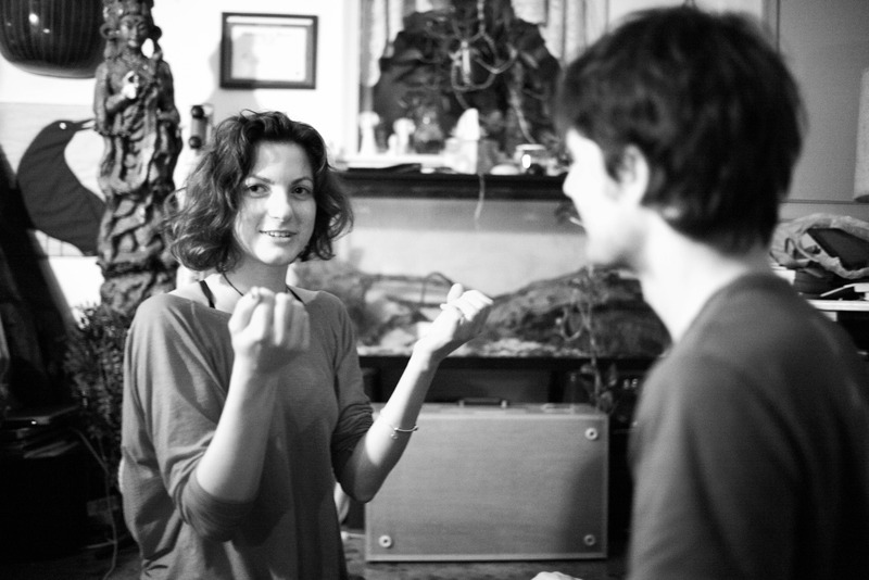 In a cozy, intimate space, a young woman animatedly gestures while engaging in conversation. The soft, natural lighting enhances the warm atmosphere, and the monochrome palette adds a timeless quality to the moment. The focus on her expressive face contrasts with the blurred figure of her companion, emphasizing the connection between them.