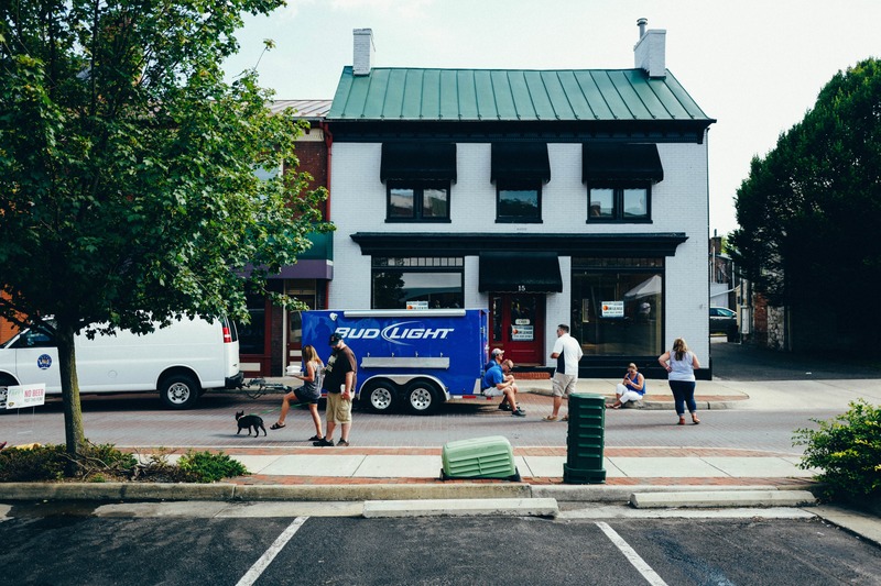 A vibrant street scene captures a casual outdoor gathering in an inviting neighborhood. An array of people, some relaxing and others engaged in conversation, form a lively atmosphere under soft daylight, accentuating the warm hues of summer. The blue Bud Light trailer serves as a focal point, harmonizing with the rustic charm of the surrounding buildings and greenery.