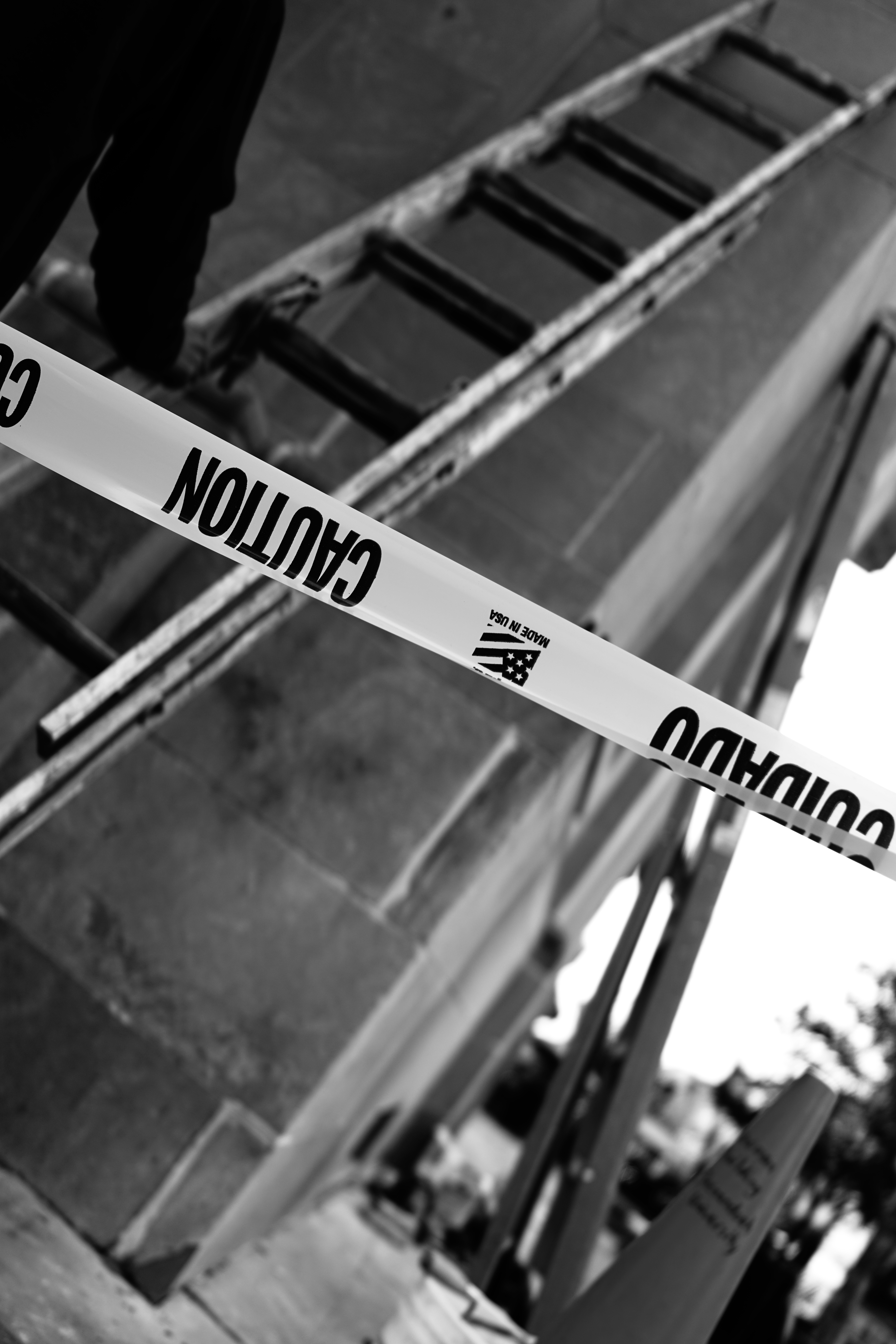 This striking black-and-white photograph captures a scene of impending danger, with a bold 'CAUTION' tape stretching across the frame. The diagonal composition includes a shadowy figure next to a leaning ladder, adding a sense of urgency and tension, while the diffused lighting hints at a cloudy day, evoking a mood of unease and foreboding.