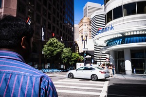 A man stands at a busy street crossing, gazing at the bustling city ahead, his back turned to the camera. The scene is illuminated by bright sunlight, casting vivid shadows on the pavement while modern buildings frame the composition with a blend of glass and concrete. The mood is one of anticipation and solitude, capturing a slice of urban life in motion.