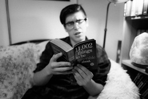 In a cozy, dimly lit room, a person with glasses sits comfortably on a plush sofa, engrossed in a book titled '11,002 things to be miserable about.' The black-and-white composition amplifies the mood of introspection and mild exasperation, as the subject's furrowed brow suggests a mix of bemusement and reflection on the themes presented in the book.