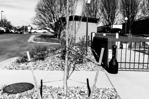 In this stark black-and-white photograph, a small tree stands resilient amidst a concrete landscape, its thin branches barely visible. The surrounding compositional elements, including rocky mulch and a distant fence, frame the tree, evoking a sense of solitude and the quiet persistence of nature in an urban environment. The bright midday light casts sharp shadows, enhancing the contrast and drawing attention to the delicate yet determined subject against a backdrop of man-made structures.