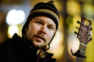 A soulful musician gazes directly into the camera, his expression thoughtful and inviting. The warm, blurred lights in the background create an intimate ambiance, contrasting with the cool tones of his winter attire. Subtle shadows play across his face, enhancing a sense of contemplation and artistic depth.