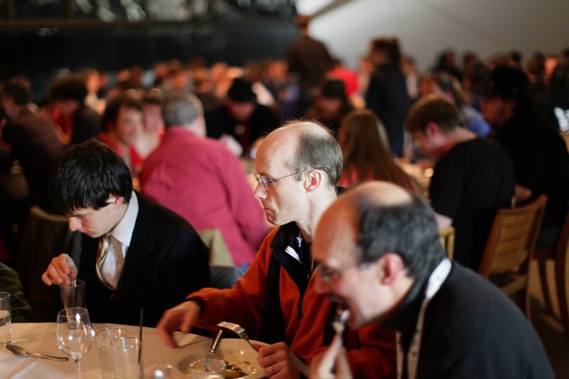 In a bustling dining room filled with attendees, the image captures a moment of focus amid the lively chatter. Soft, ambient lighting casts a warm glow over the tables as individuals eat, deep in conversation or contemplation. The composition pulls the viewer into the intimacy of shared meals and connection, highlighting a sense of community in the midst of a larger event.