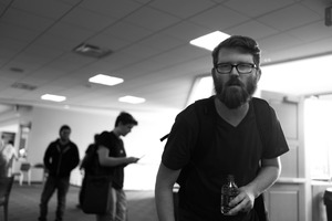 The photograph captures a moment in a bustling environment, with the foreground subject—a bearded man—appearing slightly caught off-guard as he clutches a water bottle. The soft focus and monochromatic tones create a sense of introspection amid the background figures absorbed in their own activities. Natural light filters in from an adjacent doorway, adding a subtle glow that contrasts with the overall calm, reflective mood of the scene.