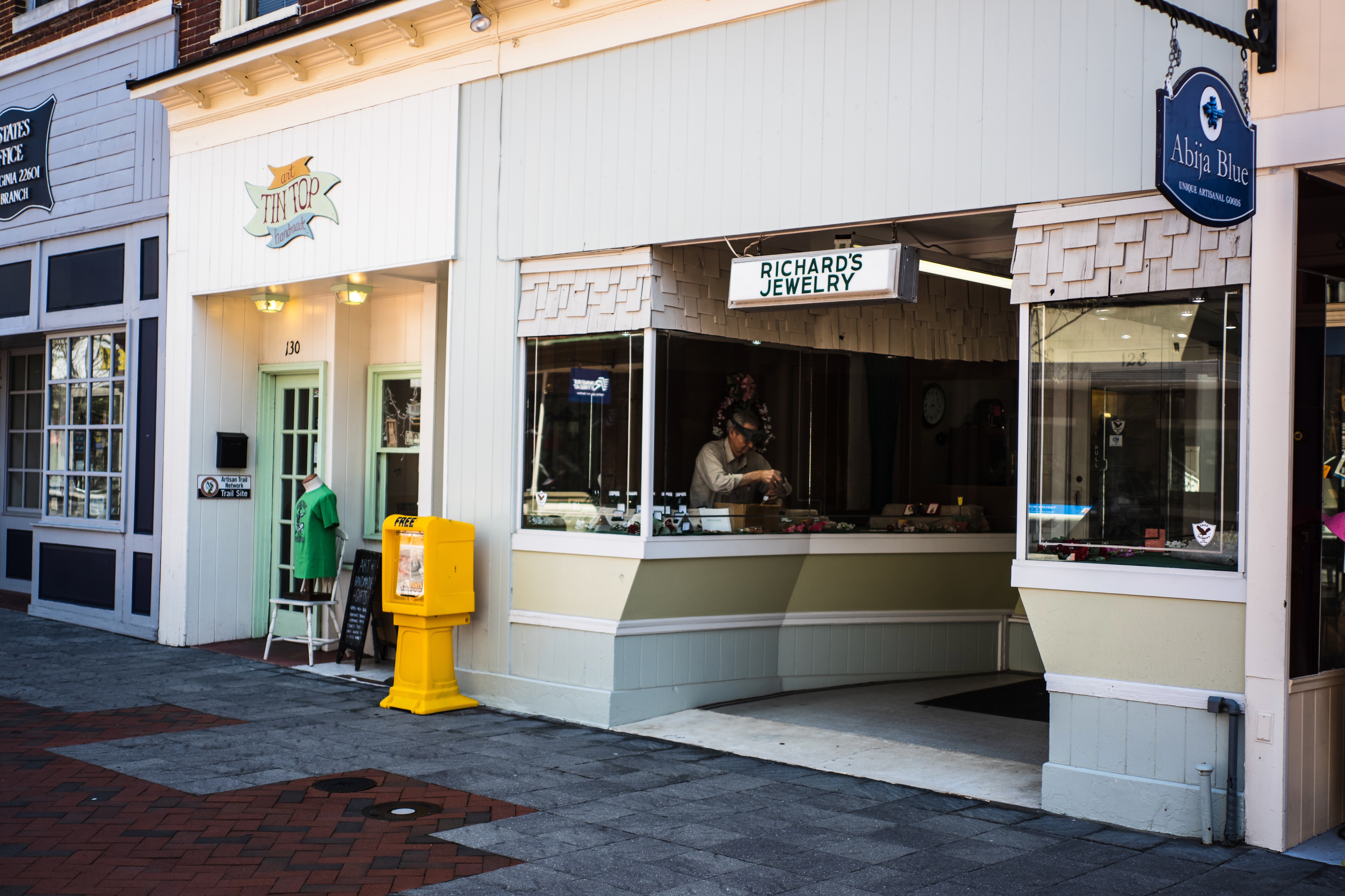 This photograph captures a serene street scene, showcasing two storefronts side by side. The warm daylight bathes the exteriors in a golden hue, creating an inviting atmosphere, while the jeweler inside the window adds a touch of life and craftsmanship to the tranquil setting.