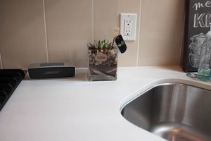 This photograph captures a tranquil kitchen nook, highlighting a small glass planter filled with pebbles and a succulent labeled 'Gratitude'. Soft, natural light bathes the scene, enhancing the clean lines of the countertop and creating a calm, inviting atmosphere, while the subtle presence of a speaker and a decorative board adds a touch of modern elegance.