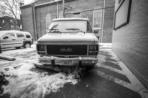 A weathered GMC van sits half-buried in snow, its once-vibrant paint dulled by time. The stark black-and-white composition emphasizes the somber mood of a cold winter day, while the brick wall and arched windows in the background add architectural depth. Soft shadows blend with the bright patches of snow, creating a stark contrast that highlights the stillness of the scene.