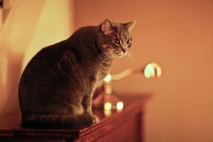 A contemplative gray cat perches elegantly on a wooden surface, bathed in warm, ambient light. The soft glow creates a serene atmosphere, highlighting the cat's keen features and attentive gaze. Its posture conveys a sense of curiosity and quiet confidence against the rich, amber backdrop.