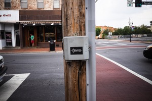 In this urban scene, a utility box and wooden pole loom in the foreground, framing a busy street corner. A person in a bright outfit stands in stark contrast to the more subdued backdrop of storefronts, evoking a sense of life amid the mundane. The diffused light hints at an overcast sky, adding a contemplative mood to the vibrant street activity.