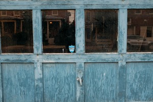 This photograph captures a weathered blue garage door with dusty glass panels, evoking a sense of nostalgia and decay. The muted colors and reflections of the surrounding neighborhood create a melancholic mood, hinting at stories hidden behind the door. Subtle lighting enhances the texture of the wood and the grime on the glass, adding depth to the overall composition.
