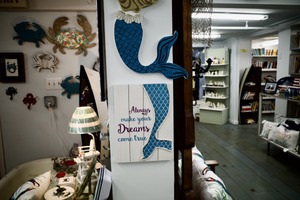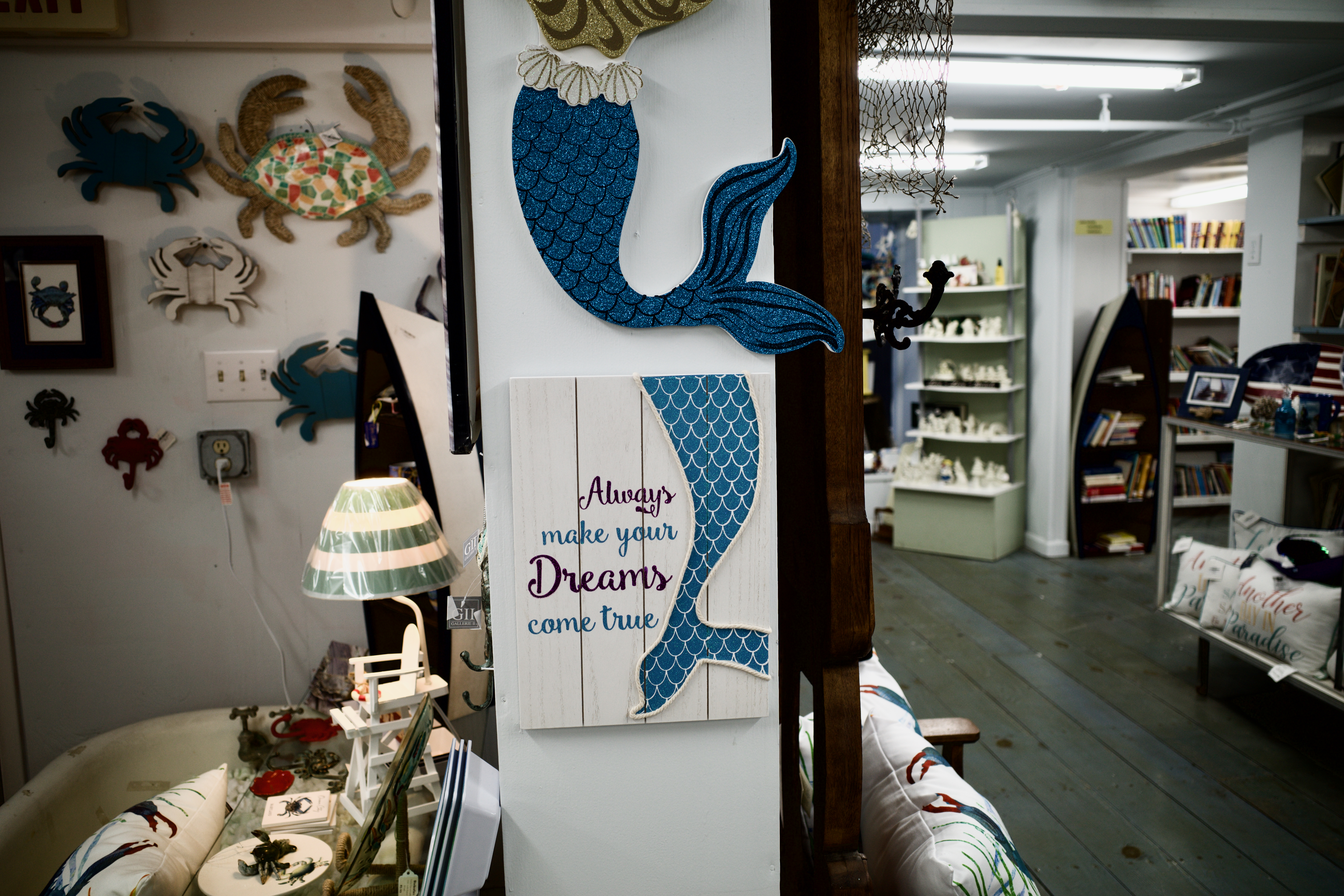 The photograph captures a charming corner of a coastal-inspired shop, showcasing a decorative wooden sign that encourages dream chasing, alongside a vibrant mermaid tail hanging on the wall. The warm lighting creates a welcoming atmosphere, highlighting the intricate textures of the decor pieces. Crab motifs in the background add a playful touch, enhancing the seaside theme of the space.