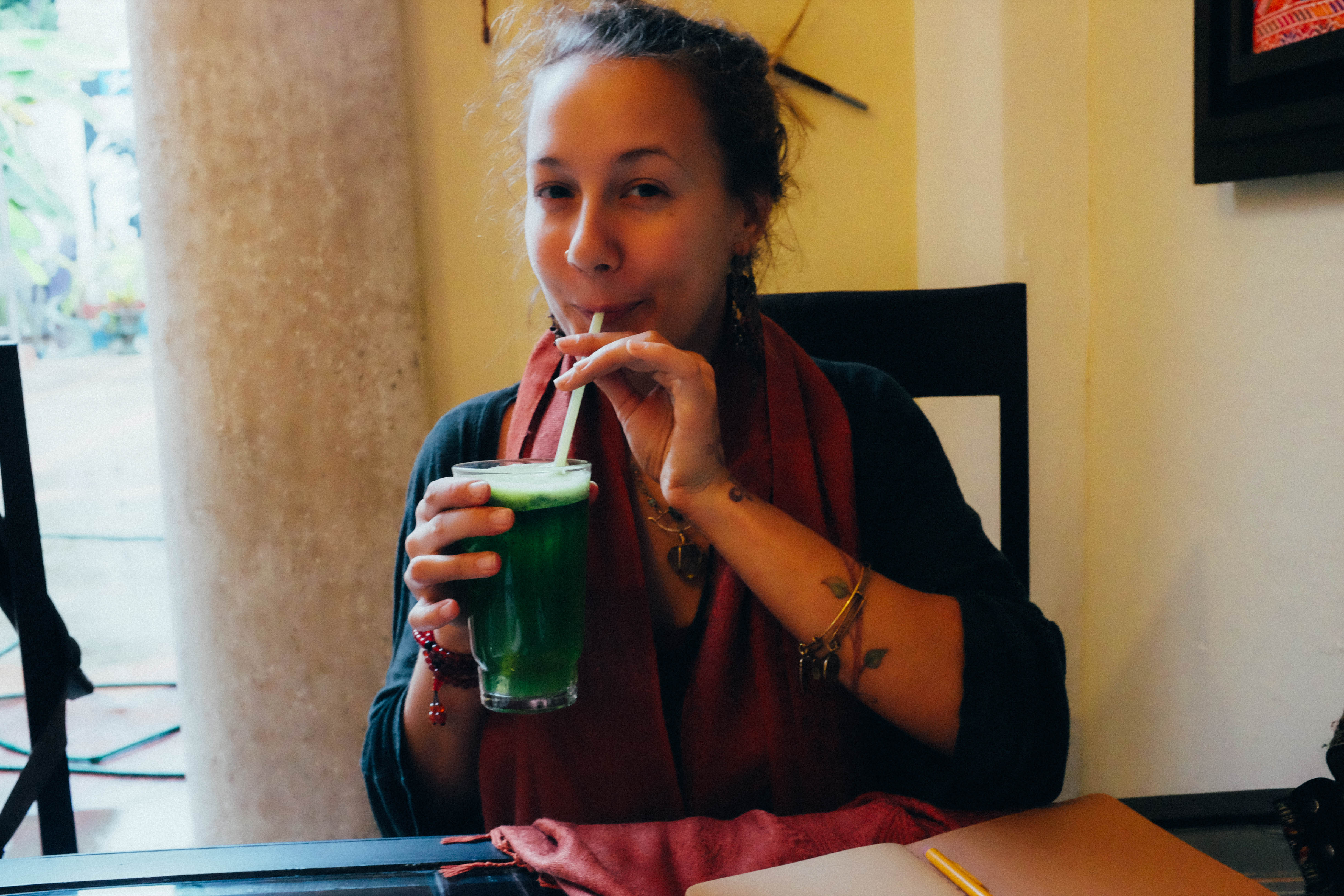 A young woman smiles playfully as she sips on a vibrant green drink, exuding a sense of joy and whimsy. The warm tones of her surroundings contrast with the cool color of her beverage, creating an inviting atmosphere. Soft lighting and a casual composition add to the relaxed vibe of the moment.