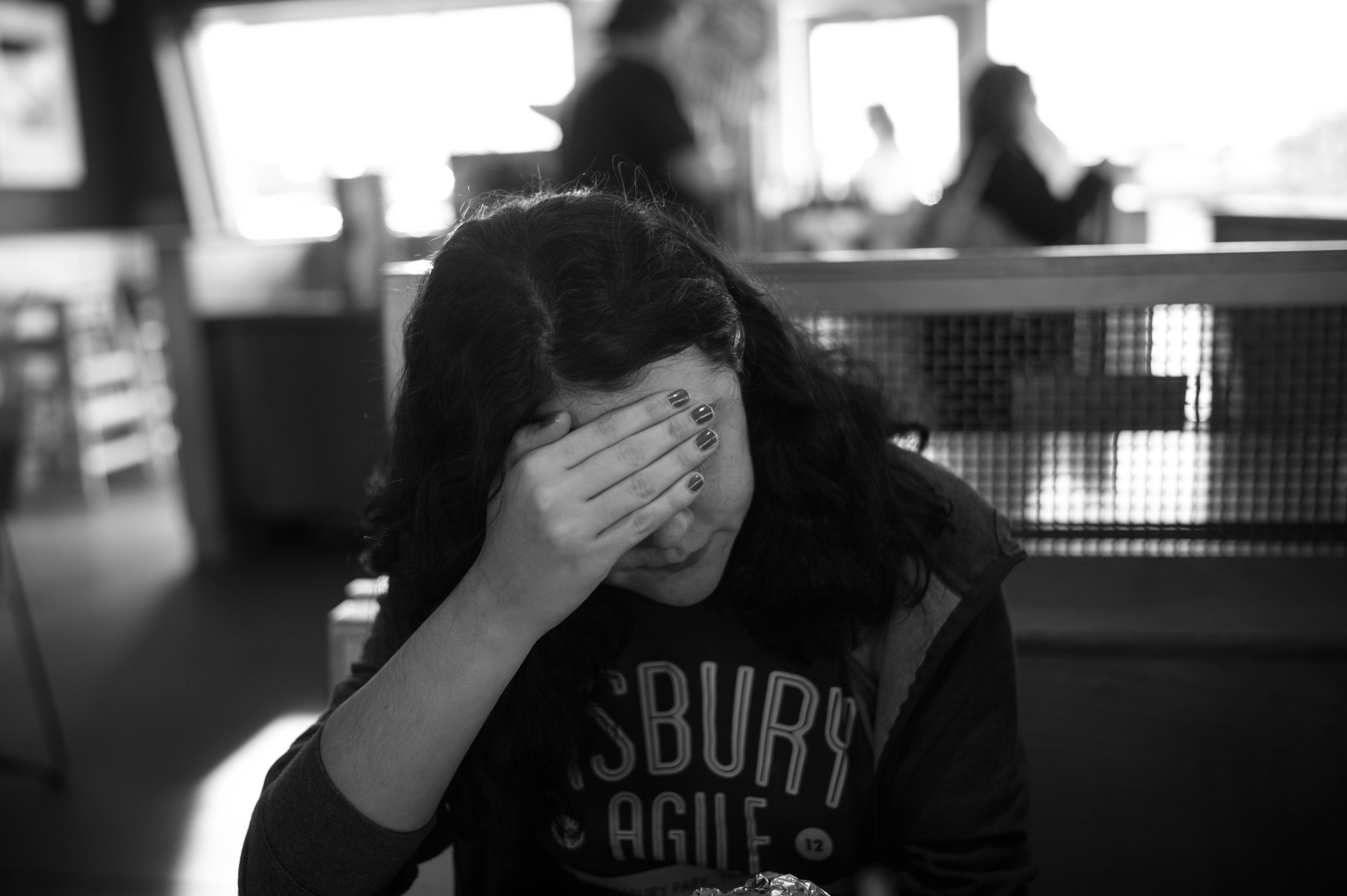 In this evocative black-and-white photograph, a young woman rests her forehead against her hand, conveying a poignant sense of distress or contemplation. The soft, diffused lighting creates a gentle atmosphere, contrasting with the bustling background, hinting at the inner turmoil amidst everyday life. Her posture and the stark composition draw the viewer into her emotional world, offering a moment of vulnerability and introspection.