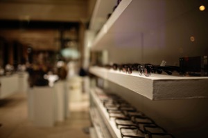 The photograph captures a stylish display of eyeglasses on a clean, minimalist shelf, creating a sharp contrast with the softly blurred background. The warm lighting casts a cozy ambiance, inviting viewers to explore the fashionable accessories. This artful depth of field draws attention to the details and textures of the glasses, enhancing the scene's sophisticated allure.
