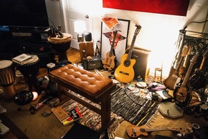 This photograph captures a vibrant music room, overflowing with instruments and creative clutter. The warm, ambient lighting casts a cozy glow over the array of guitars, drums, and scattered books, evoking a relaxed, artistic atmosphere. A button-tufted bench sits centrally, inviting connection and inspiration amidst the organized chaos.