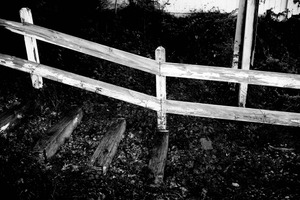 The photograph captures a weathered wooden fence, its planks contorted and slightly askew, hinting at the passage of time. The stark black and white tones evoke a sense of nostalgia and melancholy, while the play of light and shadows creates an atmospheric depth. Surrounding foliage adds a hint of wildness, contrasting with the fence's deliberate structure, suggesting an untold story of neglect or memory.